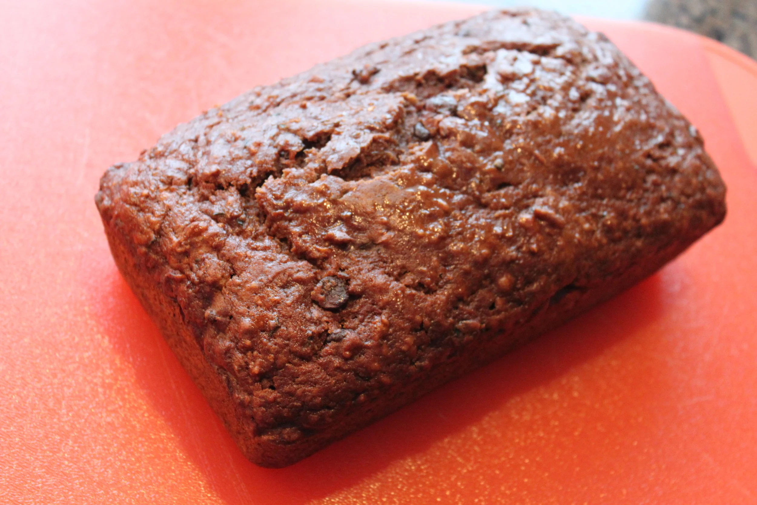 - Combine flour and the next 4 ingredients (through salt), stirring well with a whisk. Add flour mixture to sugar mixture, beating until just moist. Stir in zucchini and chocolate chips. Spoon batter into a 9x5-inch loaf pan coated with cooking spray. Bake at 350º for 1 hour or until a wooden toothpick inserted in center comes out almost clean.