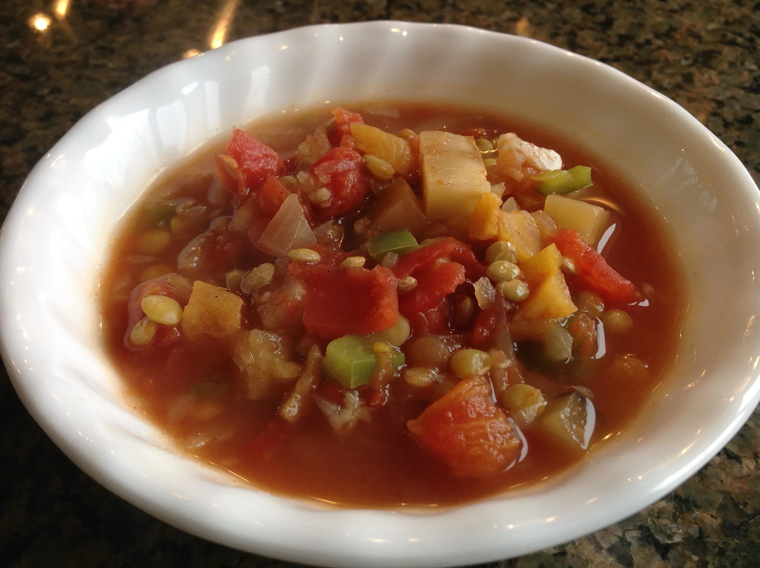6. Add the vegetable mixture to the lentils and simmer for another 30 minutes, or until the lentils are tender. Adjust the seasonings. If the soup is too thick, add more broth.