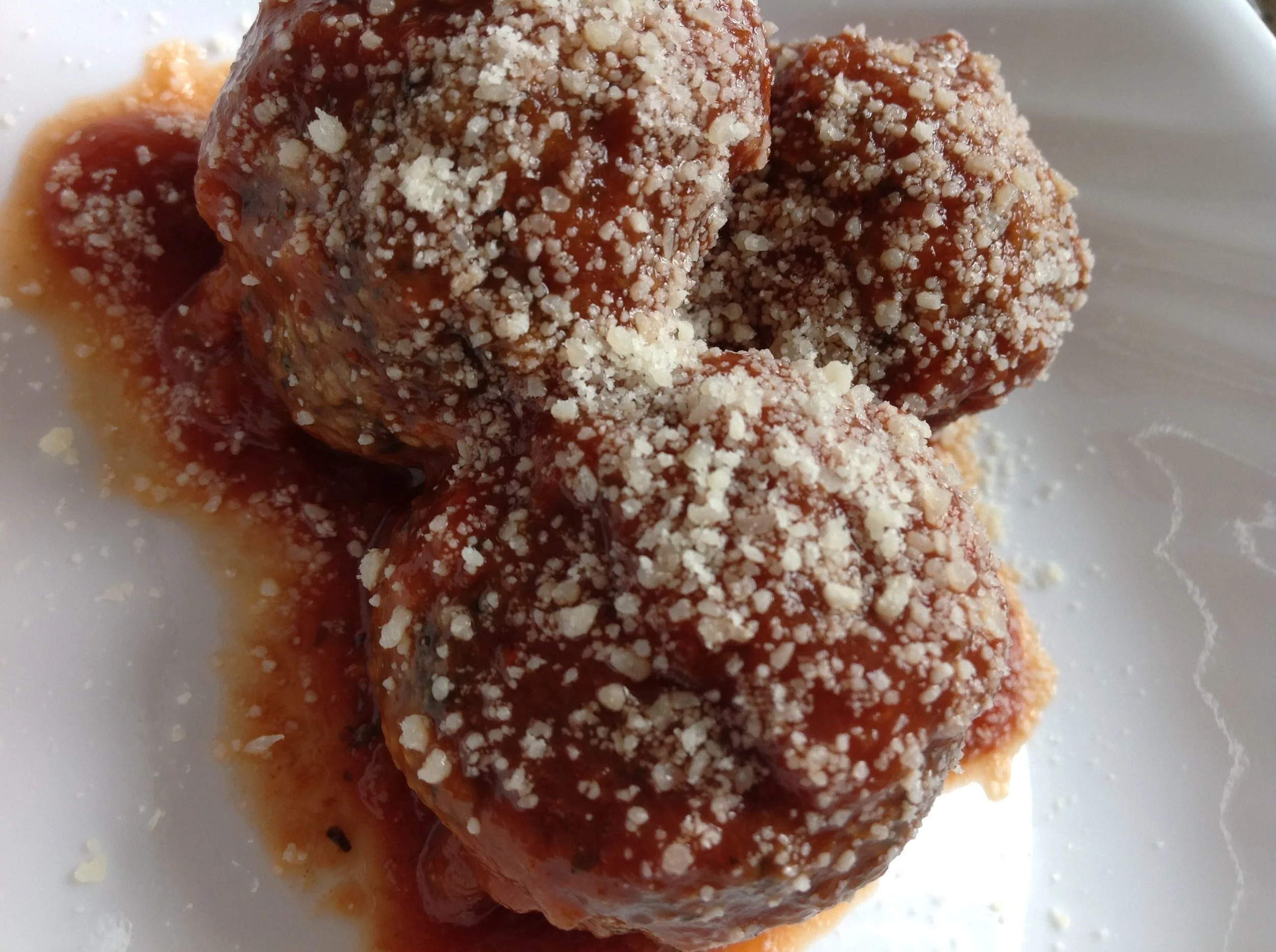 9. Bring pasta sauce to a boil in a large saucepan; reduce heat to low. Gently stir meatballs into sauce until coated. Simmer meatballs in sauce. Transfer to a bowl and garnish with 1 TBSP cheese and 1 TBSP parsley.