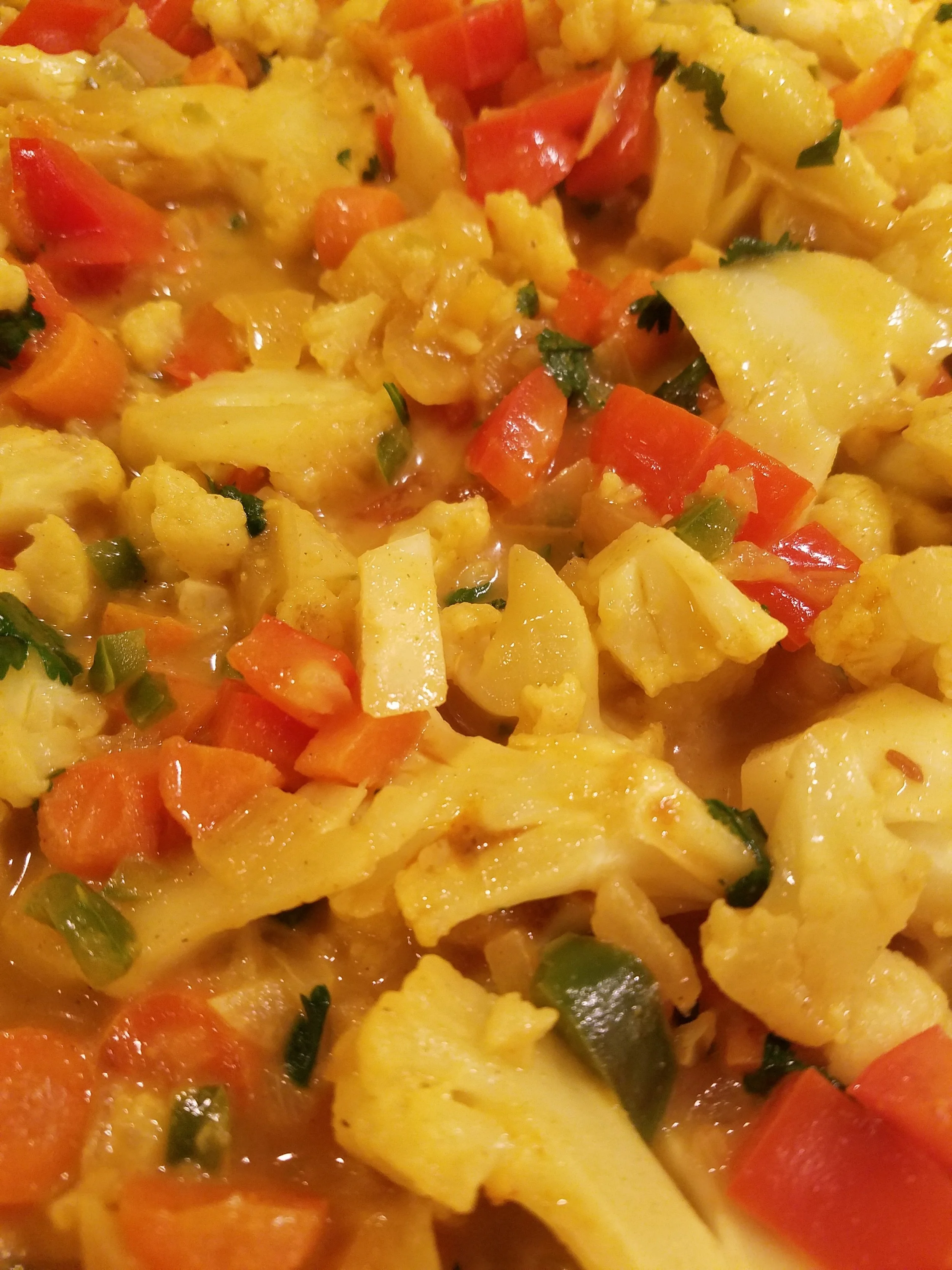 Curry is a very versatile dish that can comprise of many moving parts. In the beginning of my cooking experience, I followed recipes to the letter. I was afraid the dish wouldn’t turn out right if I didn’t. Time and experience has taught me that certain combinations just compliment each other. Take the following recipe, for instance. I had some left over cauliflower that I had purchased for another dish, some carrots, a bell pepper, a jalapeno pepper and wondered what dish could I create with these ingredients. Behold, a curry. What I love about Indian dishes is the flavor is what makes it delicious! Yes, having those vegetables is great for our bodies, but what we desire is the taste. So even in you don’t have the ingredients listed in this recipe, swap them out for what you do have. Butternut squash, potatoes (sweet or white), or edamame, it’s your choice in what you want to create. The point is to cook at home and enjoy the experience. It's less expensive and more nutritious to prepare foods in your own kitchen. This can be easily prepared in less than 30 minutes. It's a perfect weeknight meal.