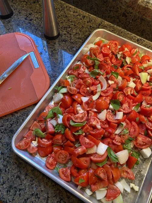Remove pan from the oven once vegetables are softened. Drain off liquid and place tomato mixture into a blender, such as a Vita-mix.