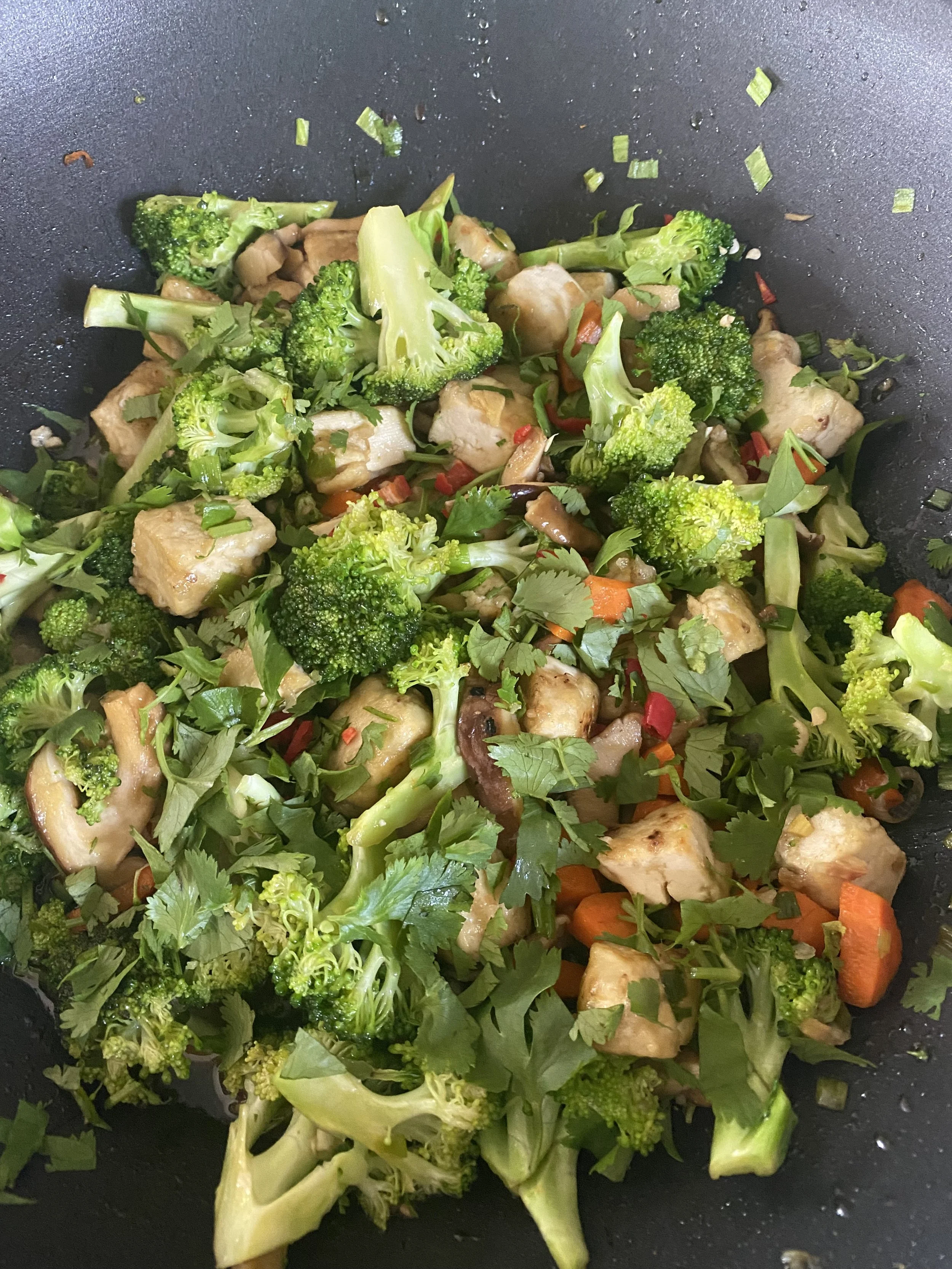 While the tofu is cooking, chop vegetables in bite-sized pieces.